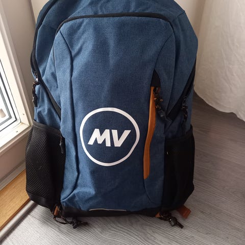 Hain sateenkestävä reppu. Vähän pientä likaa valkoisessa osassa (näkyy kuvissa), mikä lähtenee irti. Muuten hyvässä kunnossa.
