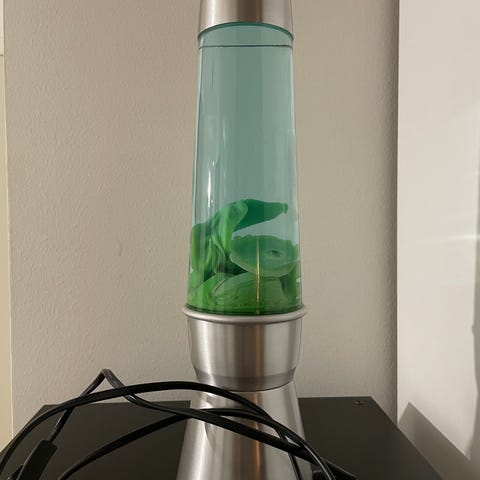 Monivärinen toimiva laavalamppu. Korkeus n. 34 cm.