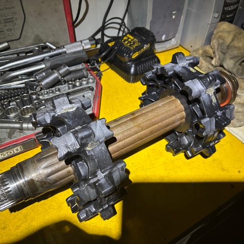 Moottorikelkan ketjukotelo, ketju ja rattaat. Kuvissa näkyy ketjukotelon sisus, ketju, kiristinvarsi sekä vetopyörät.