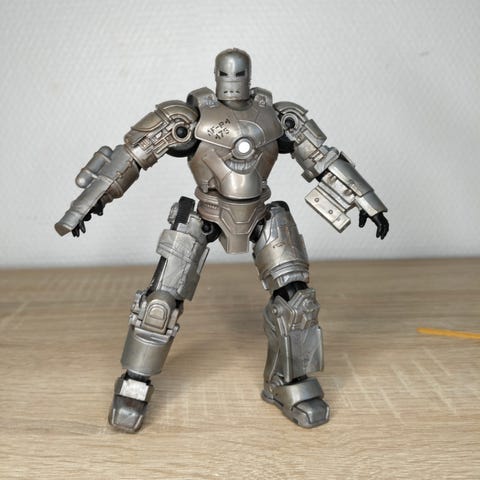 Avengers Iron Man elokuvasta 2008 Iron Monger -toimintafiguuri. Metallinvärinen, panssaroitua haarniskaa esittävä robottihahmo, jossa punainen rintakehän yksityiskohta. Nivelöidyt raajat mahdollistavat eri asennot. Sopii leikkeihin tai kokoelmaan koristeeksi. Korkeus arviolta noin 15–20 cm (arvio kuvien perusteella).