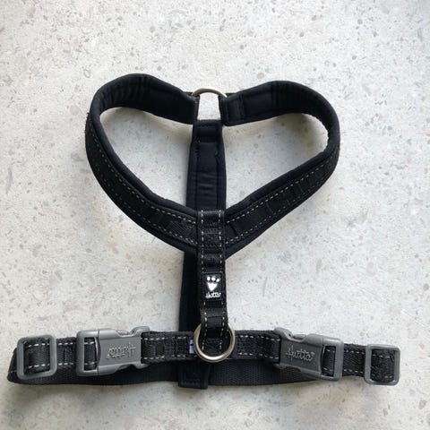 Hyväkuntoiset valjaat. Ovat olleet käytössä 20-25 kg koiralla. Hyvä säätövara kaulan ja rinnan ympärillä. Molemmilla puolilla lukitus, joten ei tarvitse nostella koiran jalkoja pukiessa ja riisuessa. Selän päällä tukeva kahva. Hyvät heijastimet.