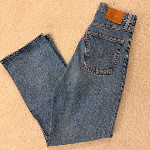 Levi’s Ribcage Bell naisten farkut. Malli on korkeavyötäröinen ja lahkeet levenevät alaspäin. Väri on sininen denim ja materiaali puuvillaa. Vyötärökoko W27 ja pituus 34. Sopivat arki- ja vapaa-ajan käyttöön. Ovh. 130€