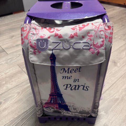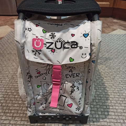 Hyväkuntoinen Züca -vetolaukku. Metallikehys ulos vedettävällä teleskooppikahvalla ja vilkkuvilla pyörillä, löytyy myös varapyörät. Kaikki taskut ja säilytysverkot ehjiä, sisäpuolella pientä kulumaa.