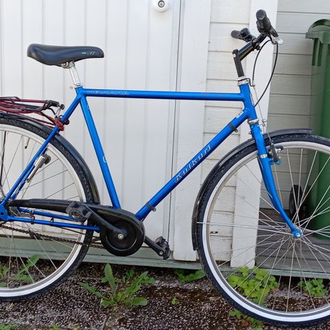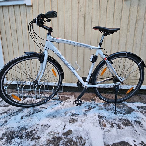 Miesten pyörä, kumeja vaihdettu. Takalaakerissa voi olla jotain vikaa, koska pyörä vispaa lievästi polkiessa.