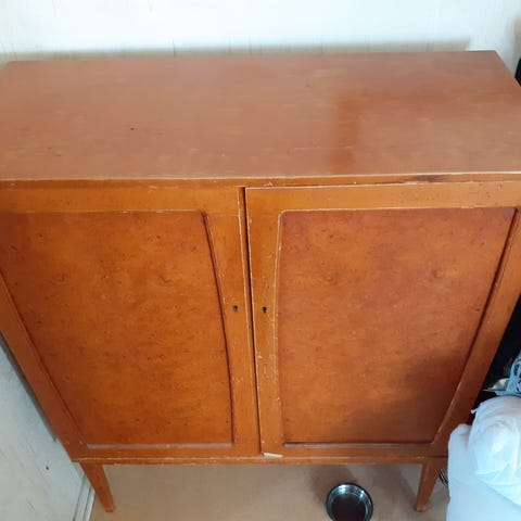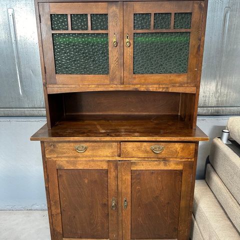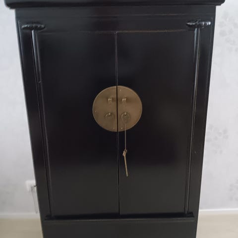 Puinen kiinalainen kaappi. Kauniit kaiverrukset ja maalaukset ovissa ja vetolaatikoissa.