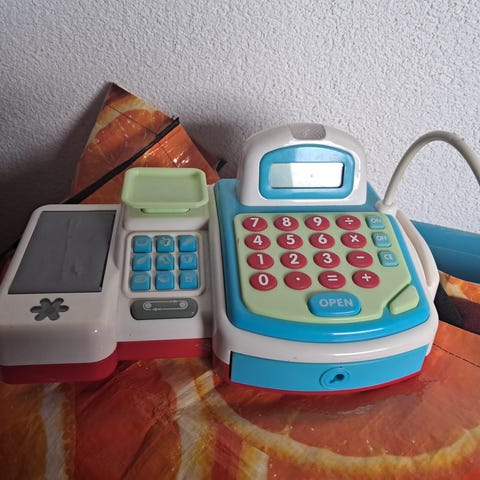 Kauppaleikkeihin toimiva frozen kassakone. Toimii pattereilla (3 x AA).