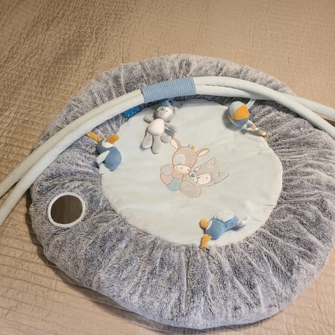 Nattou leikkimatto. Rapisevia ja äänteleviä leluja matossa ja kaaressa. Pesty hajusteettomalla, ei lemmikkejä.
