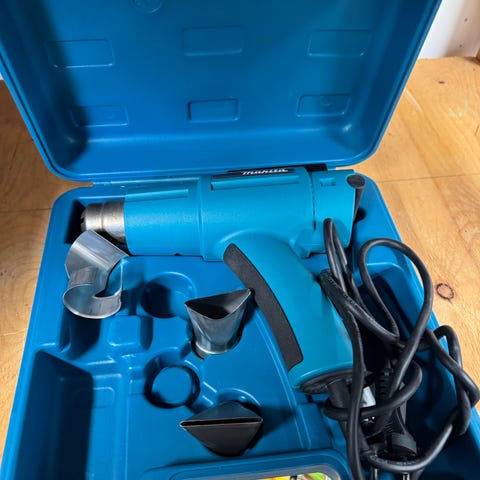 Käyttämätön Makitan kuumailmapuhallin säilytyskotelossa. Soveltuu esim maalin ja liimojen pehmentämiseen, muovin muotoiluun sekä muihin kuumailmakäsittelyä vaativiin töihin.