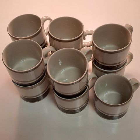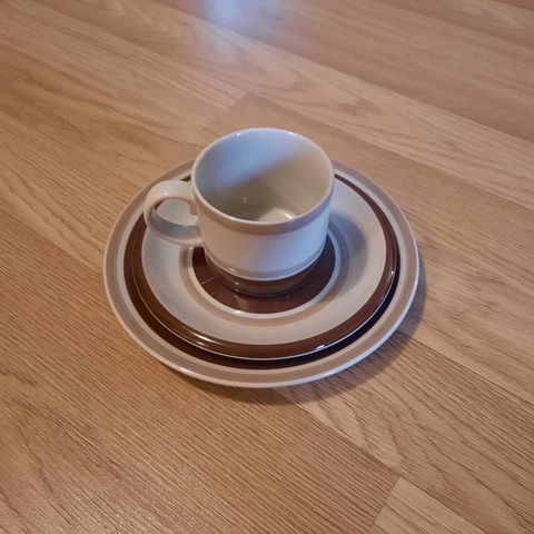 Astioissa on vaalealle pohjalle tehty ruskea rengaskuvio ja ruskea reuna. Sopii esimerkiksi kahvi- tai teehetkiin ja kattaukseen samaa sarjaa olevien muiden osien kanssa.