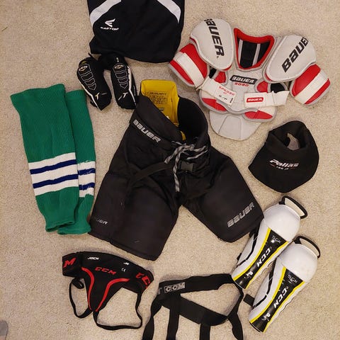 Myydään hyväkuntoinen varustesetti jääkiekkoon n.104-122cm pitkälle lapselle.