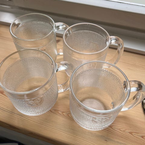 Iittala Oiva Toikka krouvi lasimuki ja Riihimäen lasin Tapio Wirkkalan sinappituoppi.