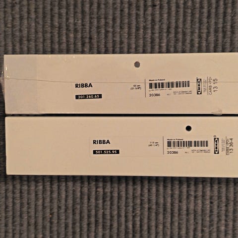IKEA Ribba hylly valkoinen. Kapeat seinähyllyt, jotka soveltuvat esimerkiksi kirjojen, taulujen tai pienten esineiden säilytykseen ja esillepanoon.