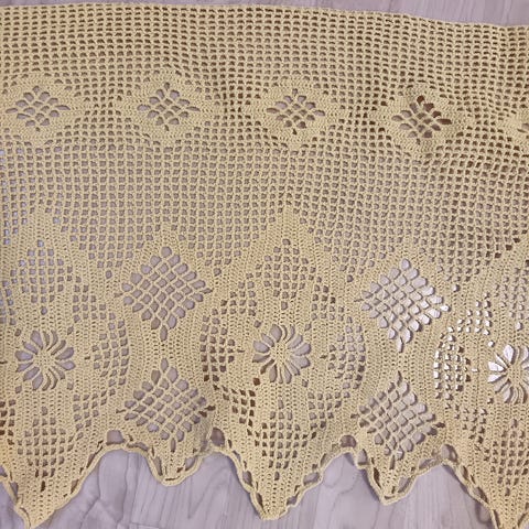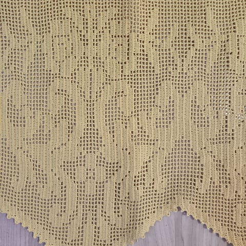 Virkattu pitsikappa aniliininpunainen. Pitsimäinen kuvioreunus ja sydän- sekä kukkakuvioita. Materiaaliohuehkoa, merseroitua todennäköisesti puuvillalankaa. Pituus 275 cm ja korkeus 60 cm. Hyvässä kunnossa. On nähty suuri työ tämän virkkaamisessa. Hinta 17 euroa. Voin lähettää. Mmm.