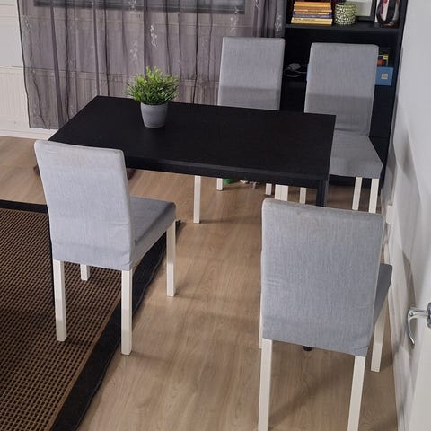 Ikean SANDSBERG merkkinen ruokailuryhmä Neljällä tuolilla. Pöytä on 110x68x75 mitoiltaan. Hyvässä kunnossa kaikki neljä tuolia ja pöytä.