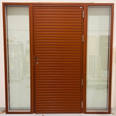 Oven Ikkunoissa grebilasi, joka päästää valoa läpi mutta rajoittaa näkyvyyttä. Sopii esimerkiksi omakotitalon tai muun asuinrakennuksen ulko-oveksi.