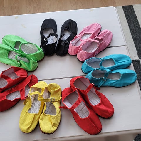 Kiinantossut, koko 36, väri musta. Kengissä on pyöreä kärki ja päällä remmi, joka suljetaan soljella, samettimainen kangas. Lähes käyttämättömät.