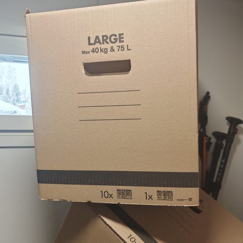 27 kpl ikean muuttolaatikkoa + 3 puuilon muuttolaatikkoa. Pari muuttoa tehnyt ennen meitä, hyvässä kunnossa, huonot karsittu pois.