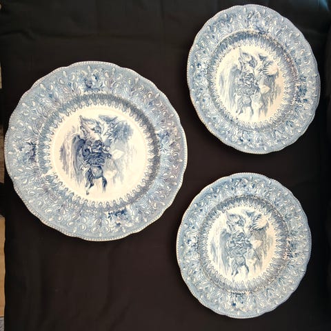 Pohjassa Rörstrandin massaleima joka oli käytössä noin 1800-1884. Lisäksi pohjassa kirjain C joka on mallimerkintä sekä H4 mistä ei ole tietoa mikä se on. C-mallin astioita valmistettiin vuosina 1866-1907. C-mallin astioiden materiaaliksi mainitaan Ironstone Chine. Paras suomennos tuolle on ehkä piikivitavara. Leiman ja mallimerkin huomioiden nämä lautaset olisi valmistettu 1866-1884 välisenä aikana.