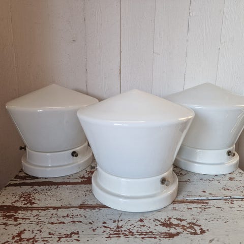 Materiaali posliinia ja opaalilasia. Ehjiä ja siitissä kunnossa, kupujen reunoissa toki pieniä elämän jälkiä, muttei mitään halkeamia tms. Metallisuojukset kauluksissa niin ei niin herkästi kiristä halki. Pohjissa yhdet läpiviennit puhkaistu kun olleet pinta-asennetuina.