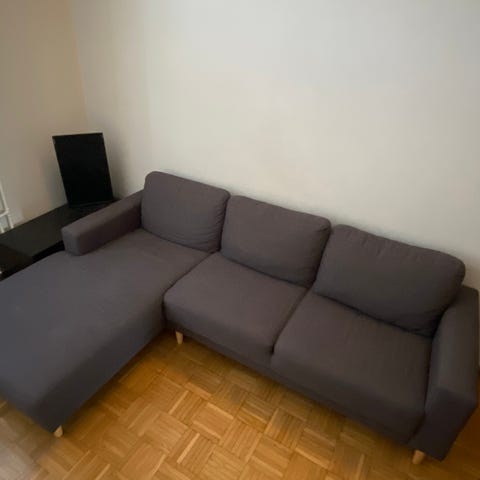 Jyskin sohva. Ostettu 4 vuotta sitten. Puhdistettu. Hieman rikki, mutta toimii hyvin istumisen kanssa. Kestää lasten jatkuvan hyppimisen aivan hyvin.