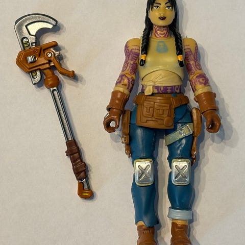 Myydään kuvien Fortnite konsolipelin hahmo ja tarvikkeet yhteishintaan 12 eurolla. Hahmon saa seisomaan jalustalle ja reppu on irrotettava.
