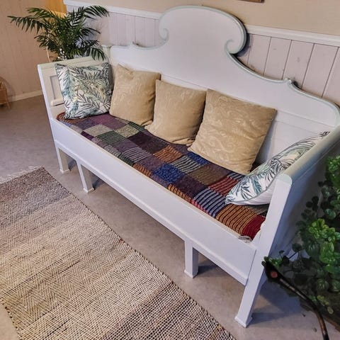 Puinen levitettävä sohva, säilytystila sohvan sisällä. Kunto hyvä/kohtalainen.