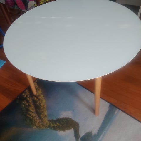 Pöydässä ei ole kolhuja tai isompia vaurioita. Pinnassa on vähän käytönjälkeä, eli pieniä, kevyitä naarmuja, jotka näkyvät viimeisessä kuvassa.