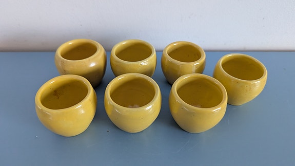 Ei halkeamia. Minimaalista käyttökulumaa. Yläreunan sisäpuolella yksi 1mm kokoinen iskemä. Tuota ei onneksi näy kun vasta läheltä valossa pyöritellessä. Maljakon yläosa ei ole täysin ympyrän muotoinen vaan yhdestä kohdasta hieman suorempi. Viat näkyy kahdessa viimeisessä kuvassa.