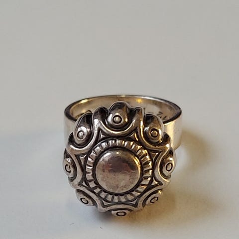 Kalevala sormus naisille. Sormuksessa on kohokuvioitu, pyöreä ja kupolimainen koristeosa, jossa on useita uurteita ja pieniä pyöreitä yksityiskohtia. Rengasosa on sileä ja tasalevyinen. Koko 18 mm. Ei kaiverruksia Esikuva Hauhon Lehdesmäestä 1000-luvulta