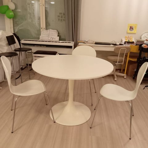 Hakusanat: sisustus, ruokapöytä, taso, huonekalu, huonekalut, puujalat, Valmistaja, pyöreä pöytä, valkoinen pöytä, käytetyt huonekalut, pöytä, pöydät, sohvapöytä