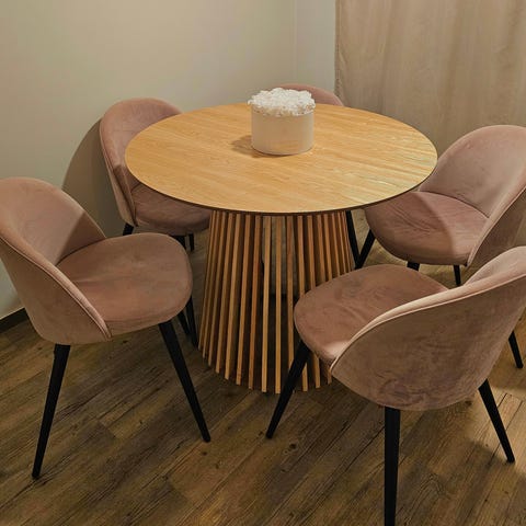Pyöreä Inno Interiorin valmistama Lab malliston pöytä, jossa on valkoinen kansi ja puunväriset jalat. Pöydän halkaisija on 100 cm, ja se sopii hyvin pieniin tiloihin. Reunoissa vähäistä kulumaa, tukeva.