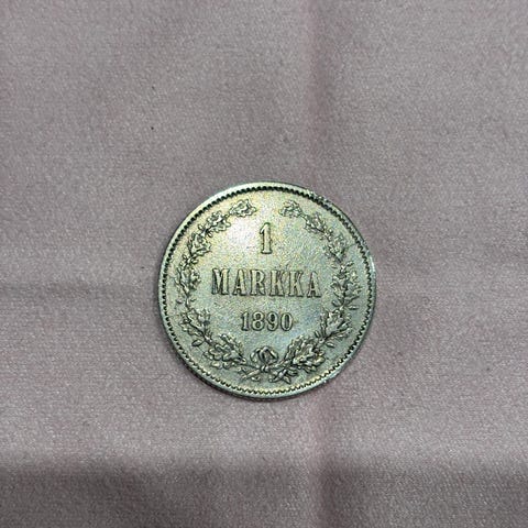 Suomen 1mk vuodelta 1890. Kolikko on suojattu pahviseen kolikkotaskuun. Soveltuu kokoelmakäyttöön tai numismatiikan harrastajalle historialliseksi rahakohteeksi.