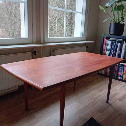 Vanha pöytä, pinnassa vähän jälkiä, muuten kunnossa. Vaikka kukkapöydäksi. 120 cm x 60 cm, korkeus 53 cm. Myydään ensimmäiselle hakijalle.