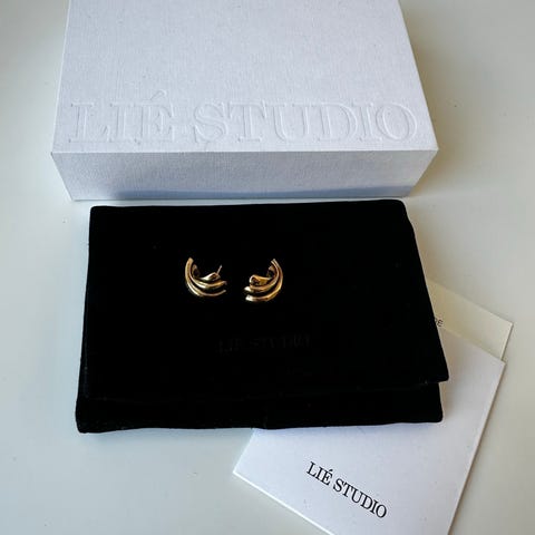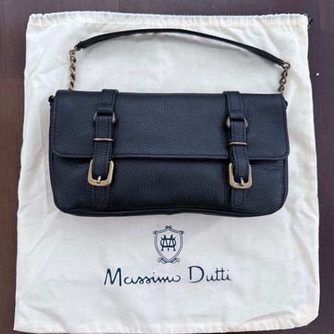 Mustaa nahkaa kultaisella metalli osalla.