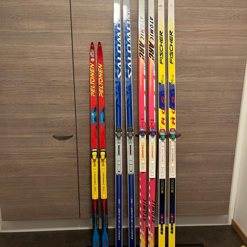 Myydään kolme paria suksia ja kaksi paria sauvoja.