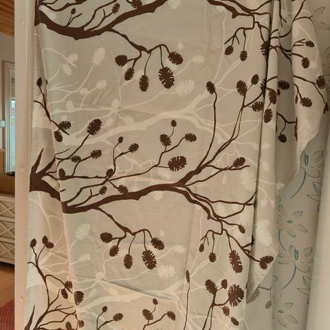 Harmaa-valkokuvioiset läpikuultavat verhot 2 kpl tankokujalla, polyesteriä, leveys 130, pituus 200 cm. Hyväkuntoiset. ToriDiili tai nouto.