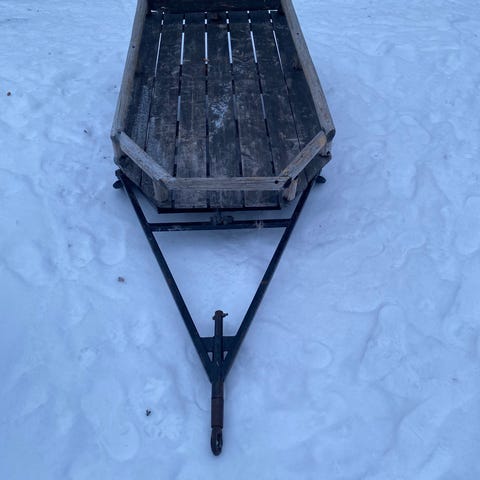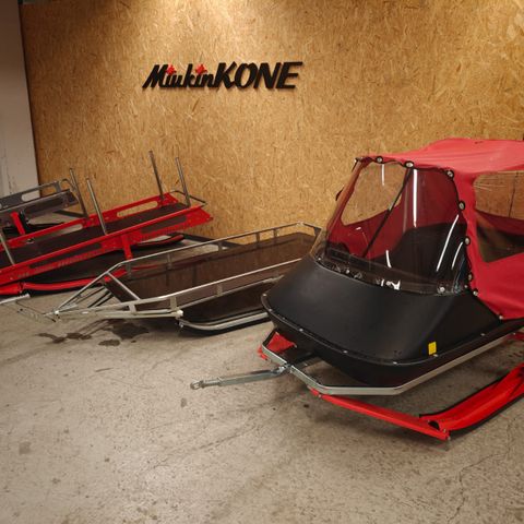 Kahden aikuisen istuttava reki. Takaosassa reilun kokoinen säilytystila.