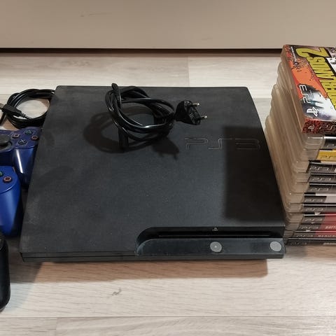 Sony Playstation 3 pelikonsoli, väri musta. Kuvissa näkyy konsoli, ohjain sekä virtajohto ja mahdollisia lisävarusteita. Mukana on useita PS3-pelejä eri genreistä, kuten urheilu- ja seikkailupelejä. Pelikonsoli soveltuu PlayStation 3 -pelien pelaamiseen ja multimedian toistoon yhteensopivan television tai näytön kanssa.