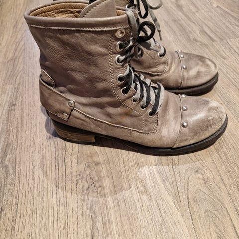 Jonkin verran käytetyt naisten nilkkurit, aitoa nahkaa ja merkki Office London. Koko on 40 ja vastaa kokoaan, jäivät minulle pieniksi. Koristeena niittejä, solkia ja aukeavat sivusta vetoketjulla. Kengän pohjien sivuissa on vettä kun pyyhin reunoja, ei siis värieroa.