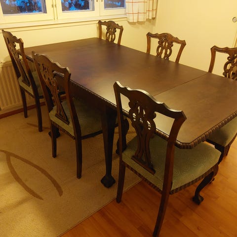 Uutta pintakäsittelyä kaipaava, mutta erittäin tukevarakenteinen, umpipuinen ja laadukas pöytä ja kuusi tuolia.