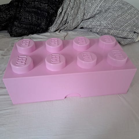 Kahdeksannuppisen LEGO-palikan muotoinen säilytyslaatikko, koko 50 x 25 x 25 cm. Leikkisä säilytysratkaisu ja sisustuselementti lapsille ja aikuisille. Hyväkuntoinen. Hinta 20 euroa. Kysy mahdollisuutta tuoda matkan varrelle.