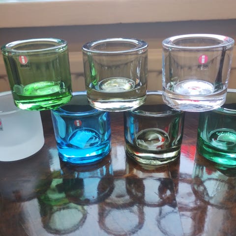 Iittala Kivi tuikkukupit, 6:ssa tarrat, kahdessa ei enää tarraa jäljellä. Myyn kaikki kerralla, kaksi vihreää,kirkas,ruskea,kaksi eri sinistä,punainen ja oranssihtava.