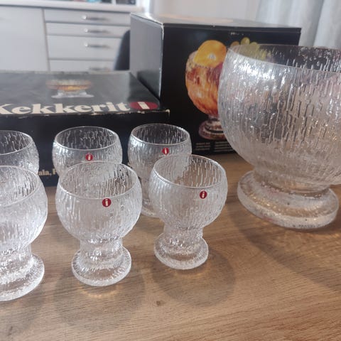 Erittäin hyväkuntoiset alkuperäisissä pakkauksissa olevat Iittalan Kuusisarjan 4kpl lasit ja kannu.