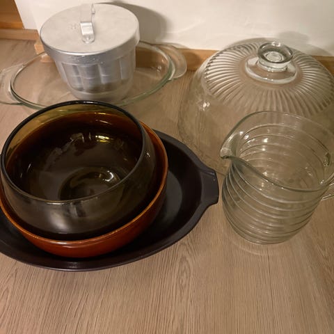 Astiasetti, johon kuuluu erilaisia kulhoja, vuokia ja tarjoiluastioita. Setissä on muun muassa valkoisia posliinivuuokia, pieni kakkuvuoka, sininen lasikulho, kermakko sekä lasinen uunivuoka. Osa astioita käyttämättömiä.