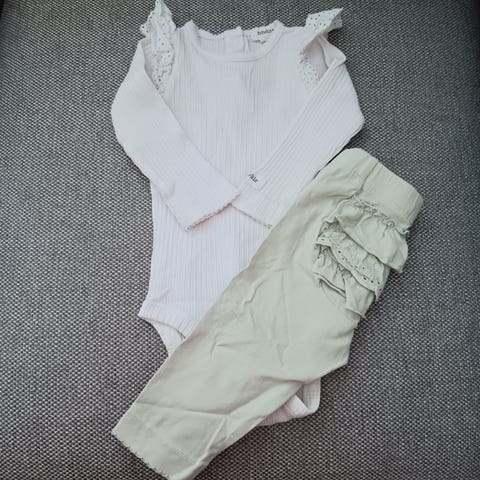 Yhdellä lapsella käytössä ollut kesäinen setti body + housut . Pesty miedon tuoksuisella pesuaineella, lemmikki koti.