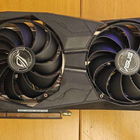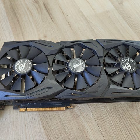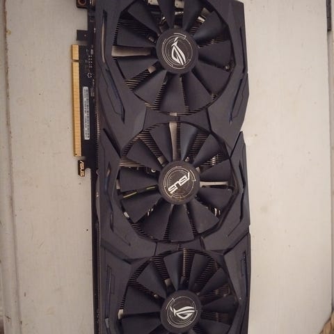 Asus ROG Strix -sarjan näytönohjain. Kortissa on kolmen tuulettimen jäähdytys ja musta suojakuori. Takapuolella on täyspitkä backplate. Liitäntöinä muun muassa useita DisplayPort- ja HDMI-portteja sekä DVI-liitin (tarkat mallit ja versiot eivät tiedossa). Näytönohjain sopii PCI Express -liitäntää tukeviin pöytäkoneisiin.