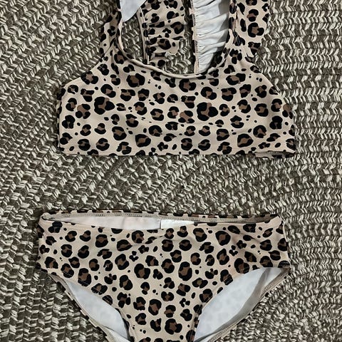 H&M lasten bikinit uimakäyttöön. Koko 110/116cm. Kaksiosainen setti, jossa yläosassa kapeat olkaimet ja alaosassa hamehelmainen alaosa. Vaalea pohjaväri ja monivärinen perhoskuviointi.