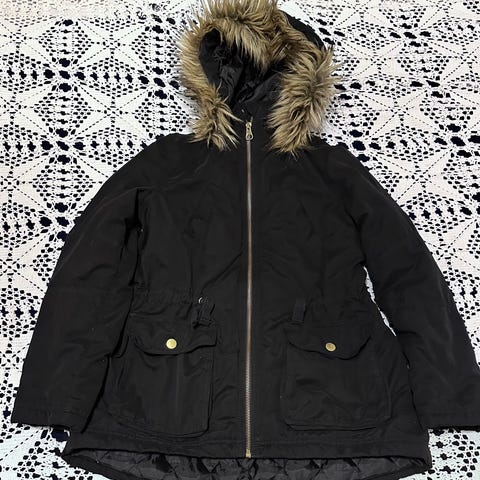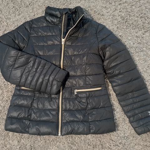Musta, hupullinen pidemmän mallinen toppatakki koossa 134cm, mutta menee hyvin vielä 140cm myös.