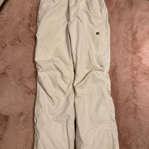 Naisten vanhat, mutta vain muutamia kertoja käytetyt lasketteluhousut, hieman rypyssä säilytyksen jäljiltä. Koko XS, lumilukot lahkeissa ja henkselit.