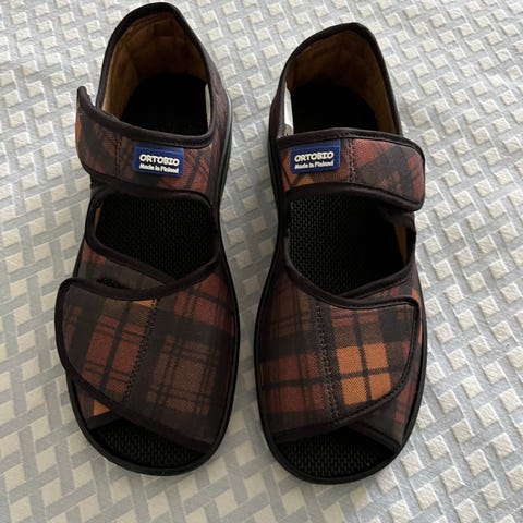 Myydään uudenveroiset Ortobio erikoisjalkineet kokoa 42. Kotimaiset. Napakka tarrakiinnitys. Väri ruskea-ruudullinen. Voi pestä pesukoneessa pesupussissa. Irrotettavan pohjallisen kokopituus n. 27cm. Puhtaat ja pestyt seuraavaa käyttäjää varten.